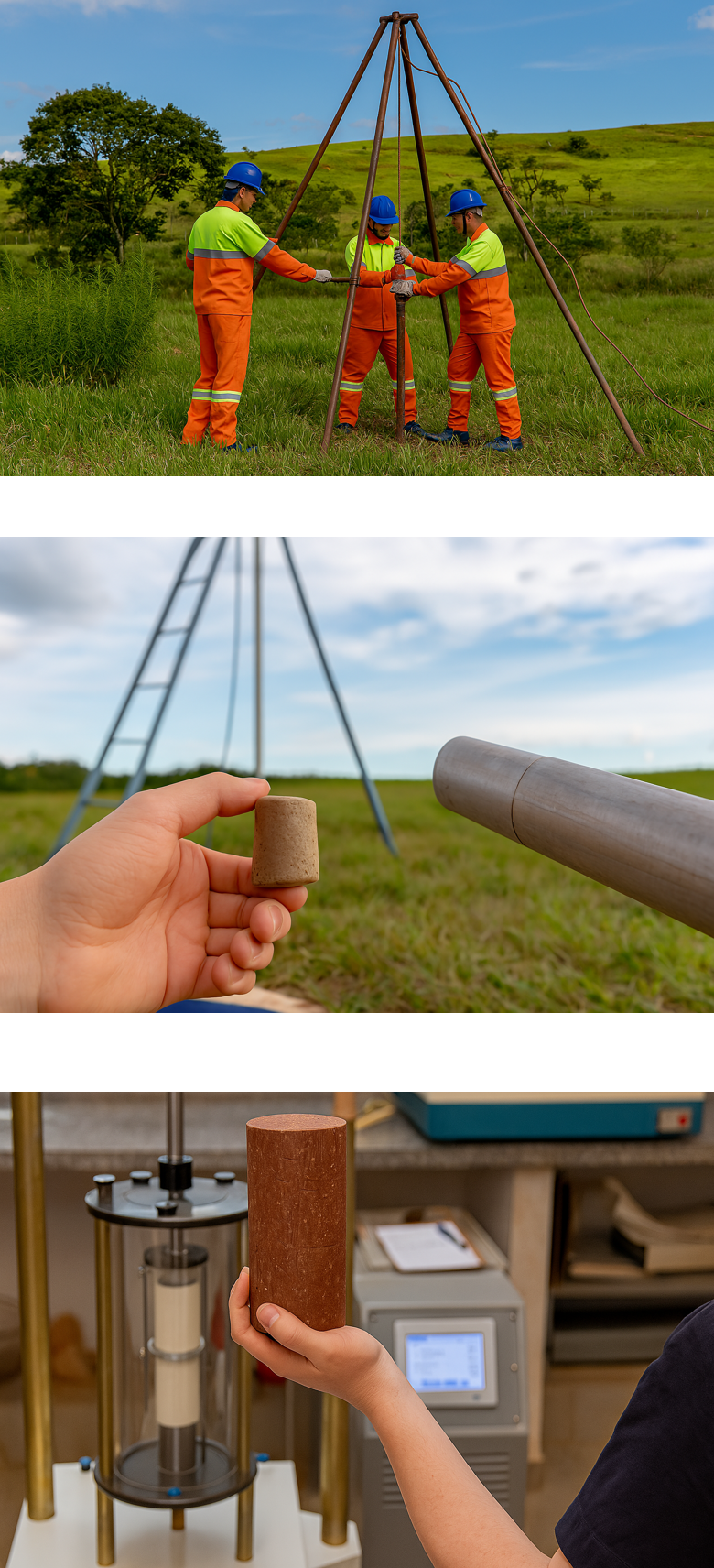 ➤ Apoio em obras civis, industriais, comerciais, loteamentos e obras públicas ➤ Investigação em terrenos planos, inclinados, áreas com restrição de acesso ou proximidade de edificações ➤ Atendimento a projetos novos, ampliações ou reforços de fundações existentes Investigações Geotécnicas Sondagem à Percussão (SPT): determinação da resistência do solo à penetração e coleta de amostras deformadas Sondagem Rotativa: extração de testemunhos em solos com presença de rocha para avaliação da qualidade do maciço Sondagem Mista (SPT + Rotativa): utilizada em terrenos com transição entre solo e rocha Mapeamento Geotécnico: levantamento visual e técnico do terreno para identificação das características superficiais e subsuperficiaisAnálises físico-mecânicas que complementam a investigação de campo e fornecem parâmetros fundamentais para dimensionamento de fundações e estabilidade de obras:
